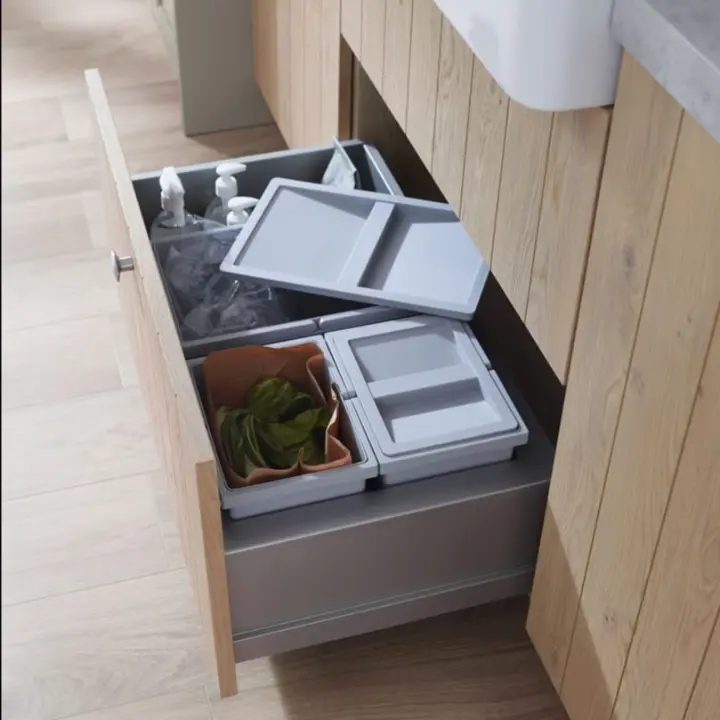 Dann schau dir dieses Bild genau an: Ein integriertes Mülltrennsystem – unauffällig im Auszug, direkt dort, wo du schnippelst und spülst. Deckel auf, Bio in den einen Behälter, Verpackung in den anderen – ein Griff, kein Umweg, keine Eimerparade.