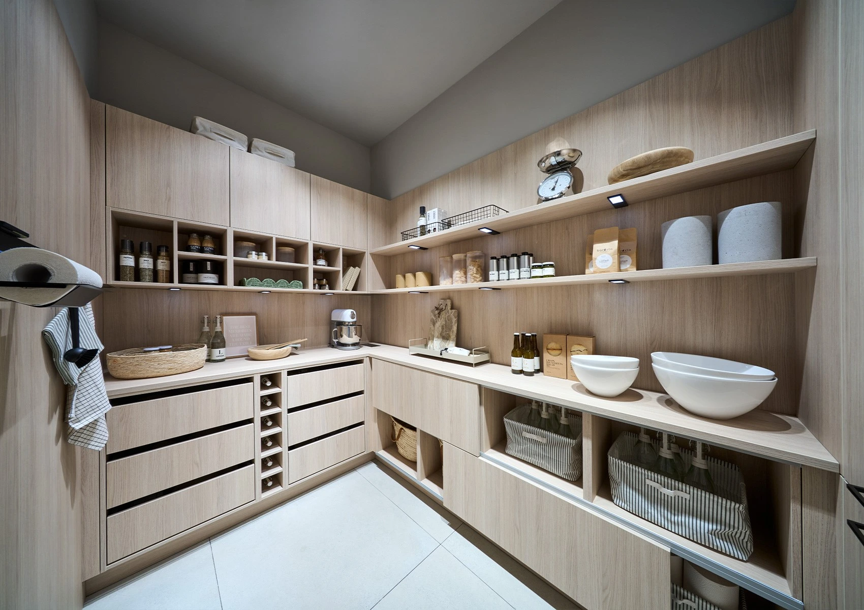 Die helle Holzoptik zieht sich wie ein roter Faden durch alle Fronten und Regale, sodass ein ruhiges Bild entsteht – selbst dann, wenn hinter den Türen ordentlich was los ist. Offene Regale zeigen bewusst ausgewählte Dinge: schöne Vorratsbehälter, Körbe, Lieblingsprodukte, die man gerne sieht; dahinter arbeiten die Auszüge im Verborgenen.
