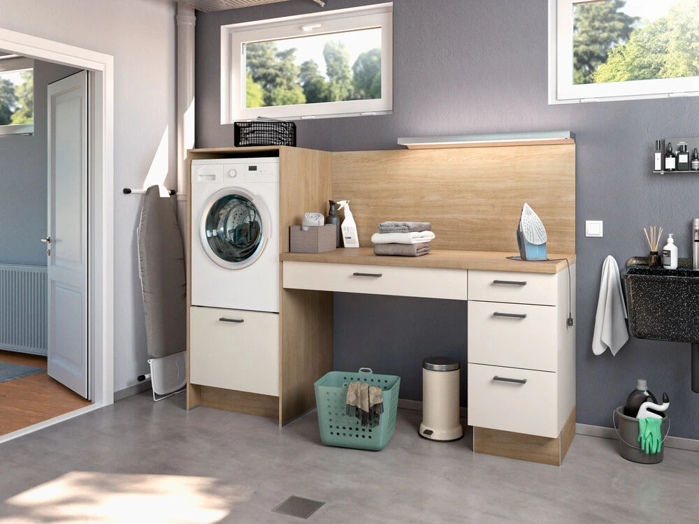 Ergonomische Unterschränke, die Waschmaschine und Trockner auf eine angenehme Höhe bringen, damit du Wäschekörbe nicht mehr aus der Hocke heraus stemmen musst.