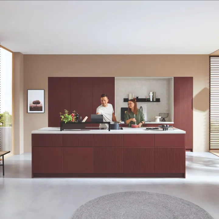 Der tiefe Rotton gibt Wärme und Charakter, ohne den Raum zu beschweren. Die Insel ist Bühne und Treffpunkt zugleich: Kaffee am Morgen, Pastateller am Abend, zwischendurch Homeoffice mit Blick auf alles Wichtige. Das wirkt einladend – nicht laut.