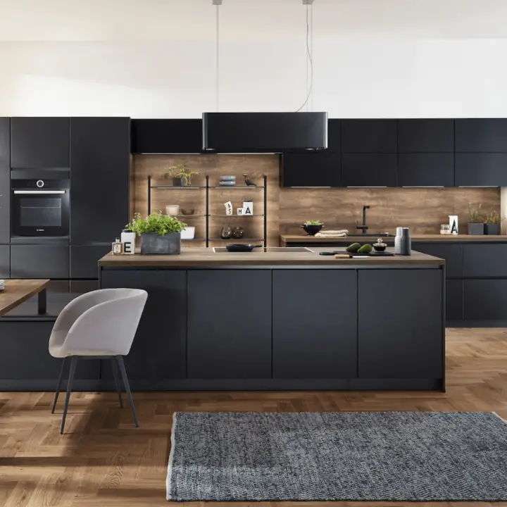 Die Kombination aus mattschwarzen Fronten, Holzakzenten und offenem Regaldesign ist nicht nur ein Trend, sondern eine zeitlose Lösung für Menschen, die Design lieben und Alltag clever gestalten wollen.
