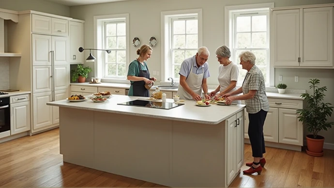 Gemeinsam kochen, sicher begleitet – moderne Wohnküche im betreuten Wohnen.